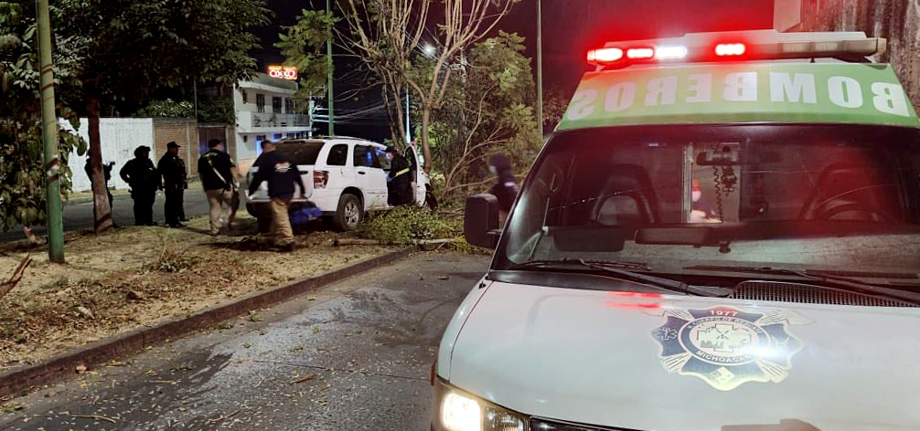 A la altura de la calle Piedras de Lumbre, frente al Oxxo que se ubica junto al panteón municipal, fue impactada por alcance y tras perder el control de la dirección, se subió al camellón tras derribar varios árboles.