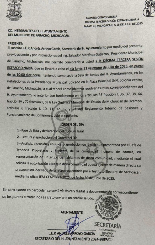 ARANZA (Paracho), Michoacán, 19 de julio de 2025.– Es mejor que el proceso culmine de manera pacífica, señalaron habitantes de esta comunidad, tras ejercer acciones de presión para que el alcalde, Salvador Martínez Gutiérrez, convocara a sesión de cabildo extraordinaria, para el análisis, discusión y en su caso, aprobación para el presupuesto directo.