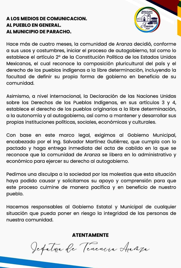 Los habitantes de esta comunidad, mediante un comunicado a la opinión pública, firmado por la jefatura de tenencia, pero no aparece el nombre de Cecilia Hernández Vidales, requieren de dicha acta de cabildo, donde se reconoce a Aranza, que se libera en lo administrativo y económico, para ejercer su derecho al autogobierno.