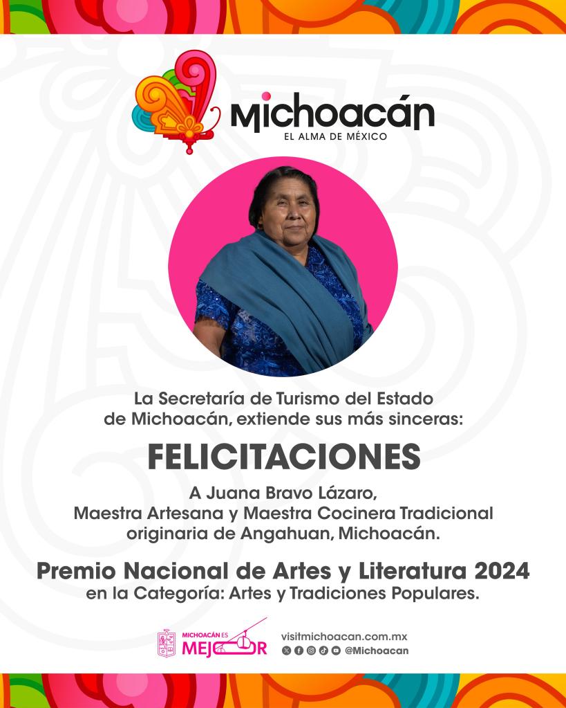 Este reconocimiento nacional otorgado por el Gobierno de México, no solo enaltece la trayectoria de Juana Bravo Lázaro, sino que también recuerda que, en Michoacán, las tradiciones no solo se visitan, se viven.