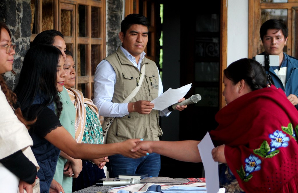ANGAHUAN, Michoacán, 24 de julio de 2025.– La presidenta del Concejo Comunal, Ma. Teresa Perucho Bravo, destacó la importancia de fomentar y preservar la artesanía, a fin de que esta se mantenga viva de generación en generación, durante la entrega de premios a ganadores del XXXIX concurso artesanal de textiles de lana y algodón 2025.
