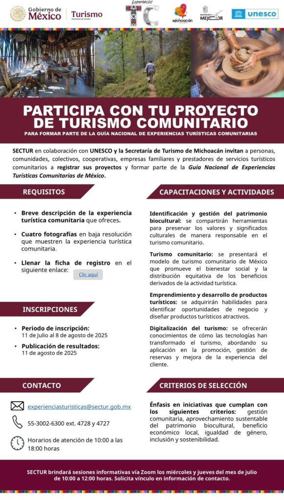 MORELIA, Michoacán, 1 de agosto 2025.- La Secretaría de Turismo de Michoacán (Sectur), continúa invitando al sector turístico estatal para que obtenga el Distintivo de Turismo Comunitario que otorga el Gobierno federal.