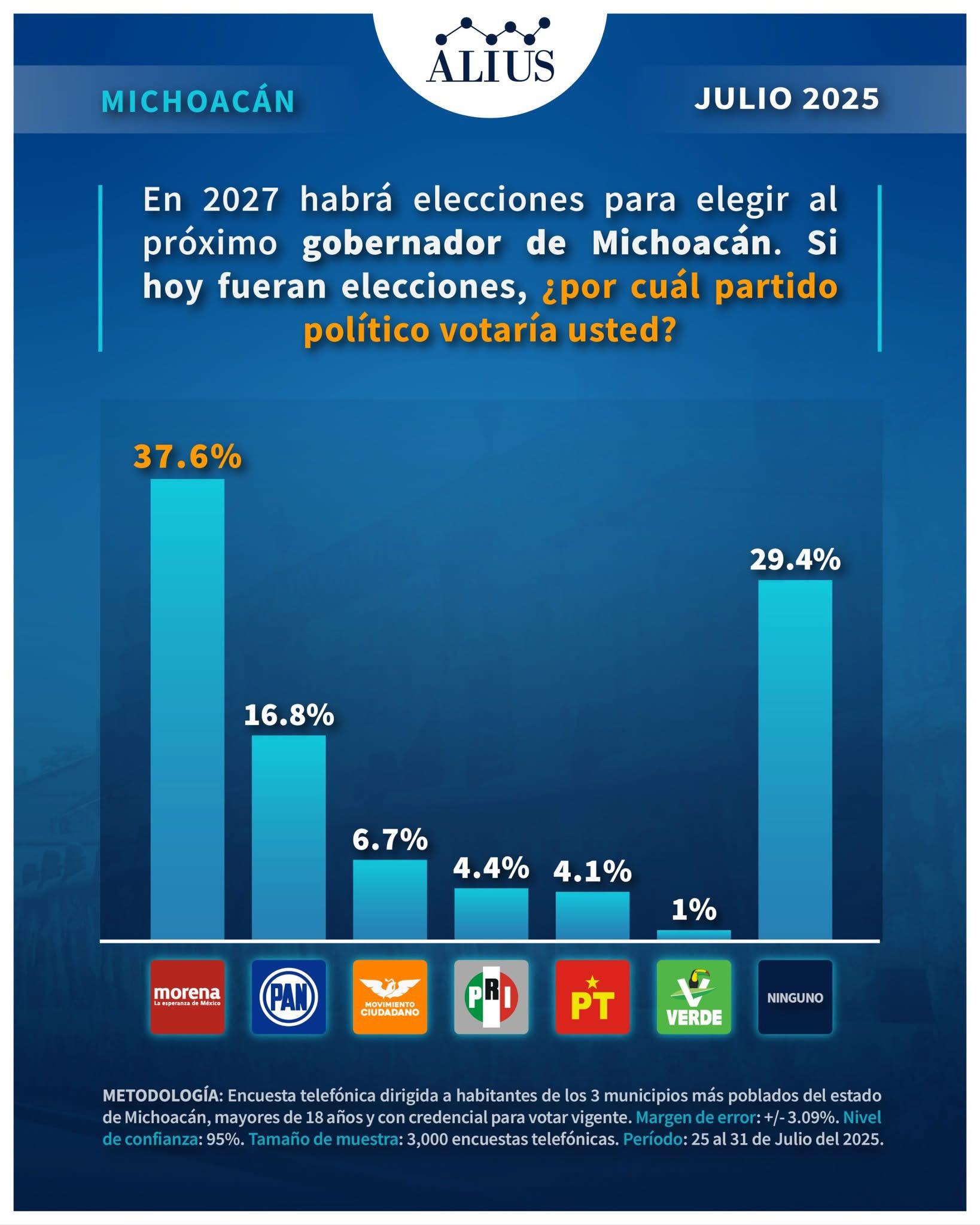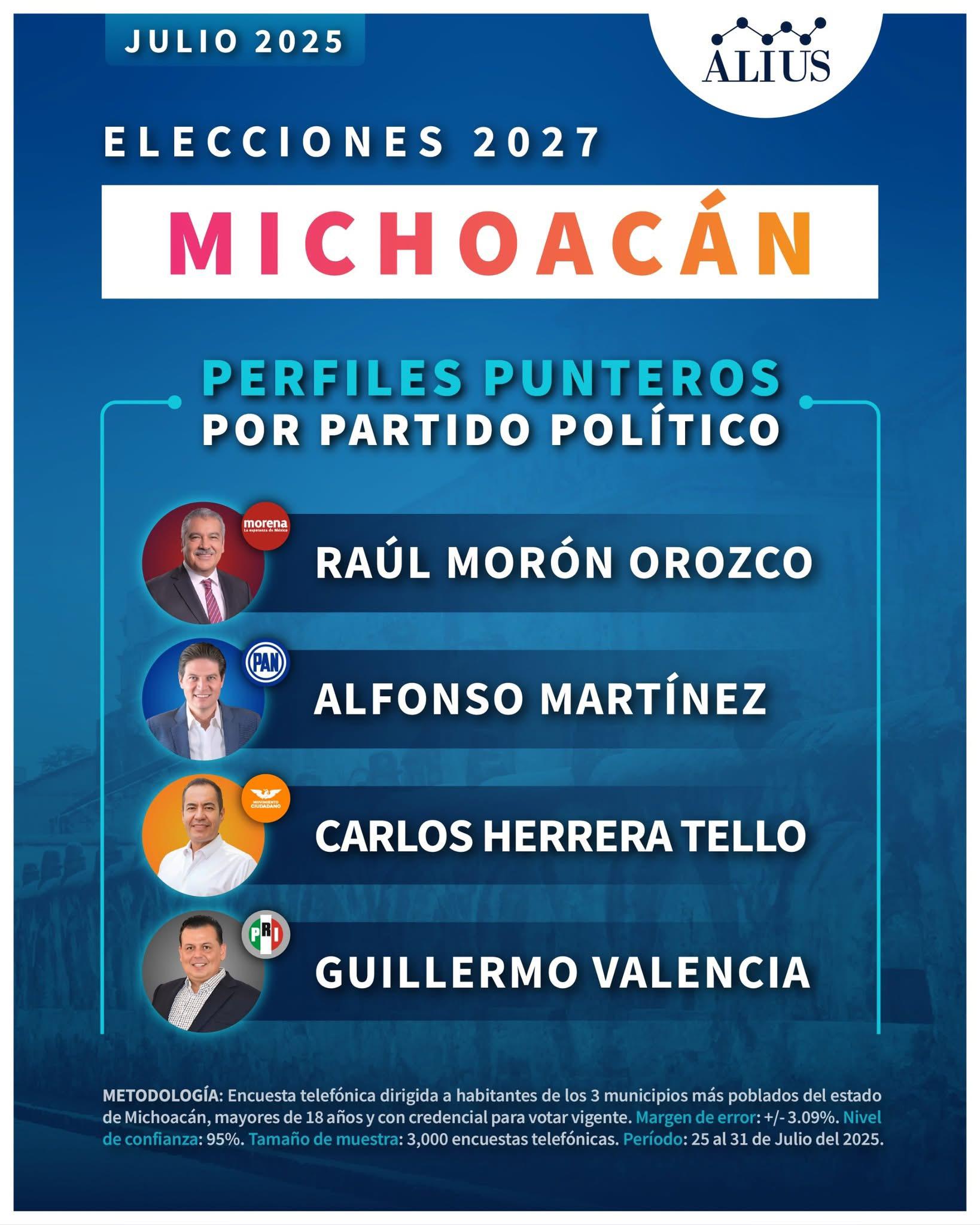 MORELIA, Michoacán, 5 de agosto de 2025.– Raúl Morón Orozco, como candidato de Morena, ganaría la gubernatura de Michoacán en las elecciones del 2027, así lo refleja la casa encuestadora y analítica Alius Polls, que, en su más reciente ejercicio, coloca al senador con un 21.6 por ciento de las preferencias y al partido guinda con el 37.6 por ciento de la intención de voto en el estado.