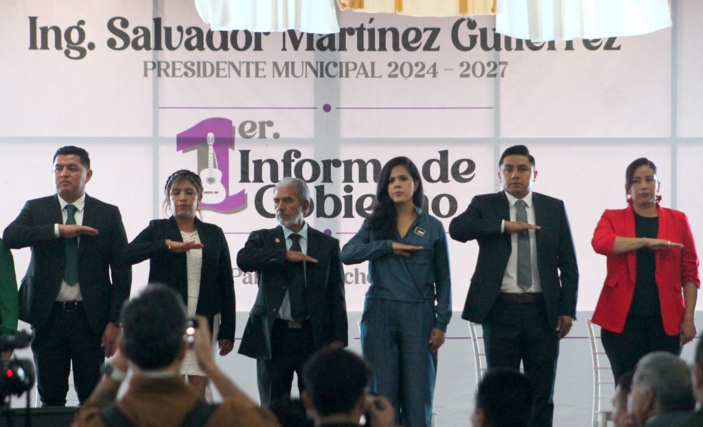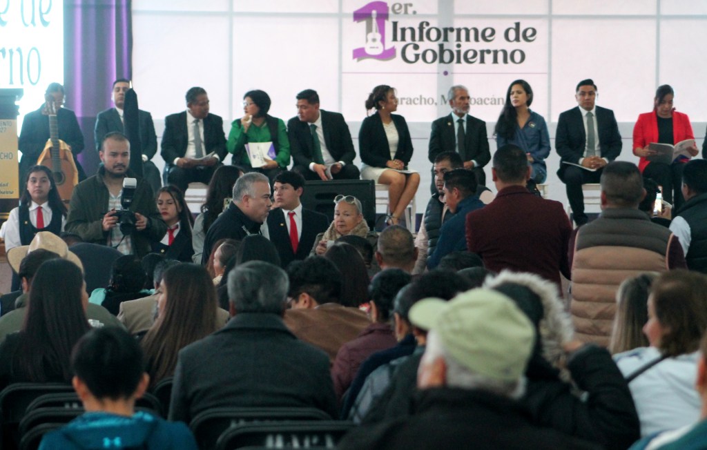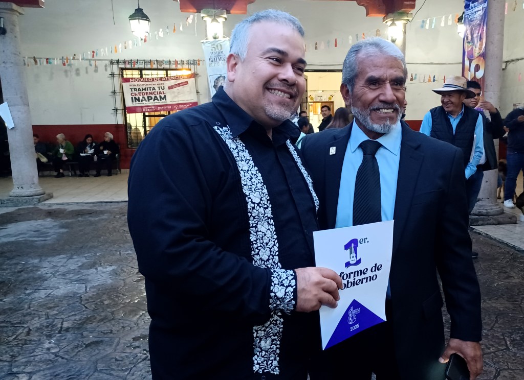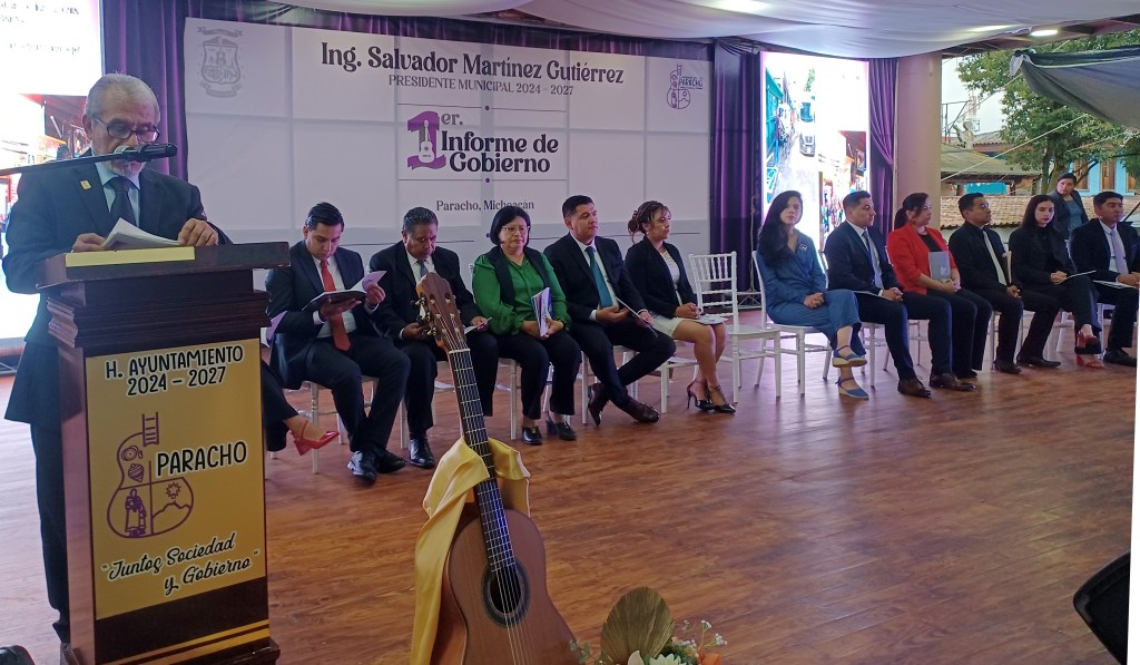 PARACHO, Michoacán, 14 de agosto de 2025.- Salvador Martínez Gutiérrez, presidente municipal de la capital mundial de la guitarra, rindió su primer informe de gobierno, en la pérgola, ante decenas de personas e invitados especiales. Destacó que juntos, sociedad y gobierno, se está haciendo historia.