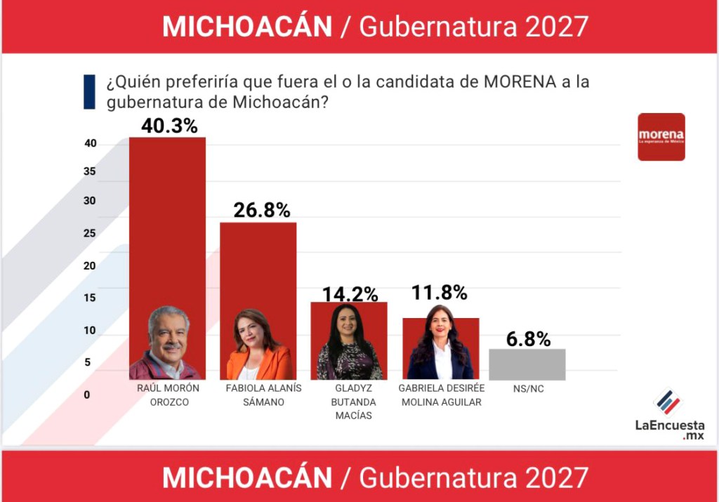 MORELIA, Michoacán, 18 de agosto de 2025.- Raúl Morón Orozco, tendría garantizada la candidatura de Morena en la contienda por la gubernatura de Michoacán en el 2027, esto, de acuerdo a un ejercicio de opinión popular hecho por La Encuesta.mx, la cual lo coloca como el perfil mejor posicionado en la disputa interna del partido.