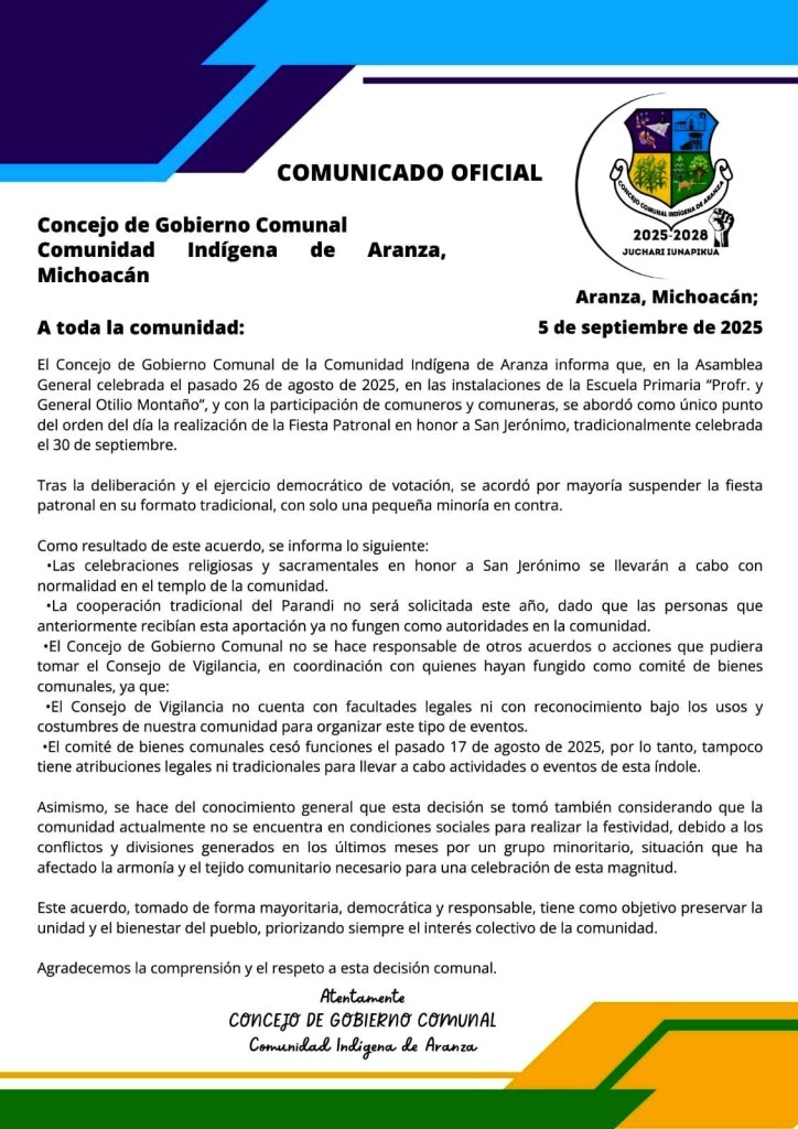 ARANZA (Paracho), Michoacán, 8 de septiembre de 2025.– A pesar del ambiente que se vive en esta comunidad, la fiesta patronal se realizará con eventos deportivos, culturales y religiosos, el 30 de septiembre, solamente el concurso artesanal, organizado por la Casa de las Artesanías (Casart), ha sido pospuesto para el domingo 7 de diciembre.