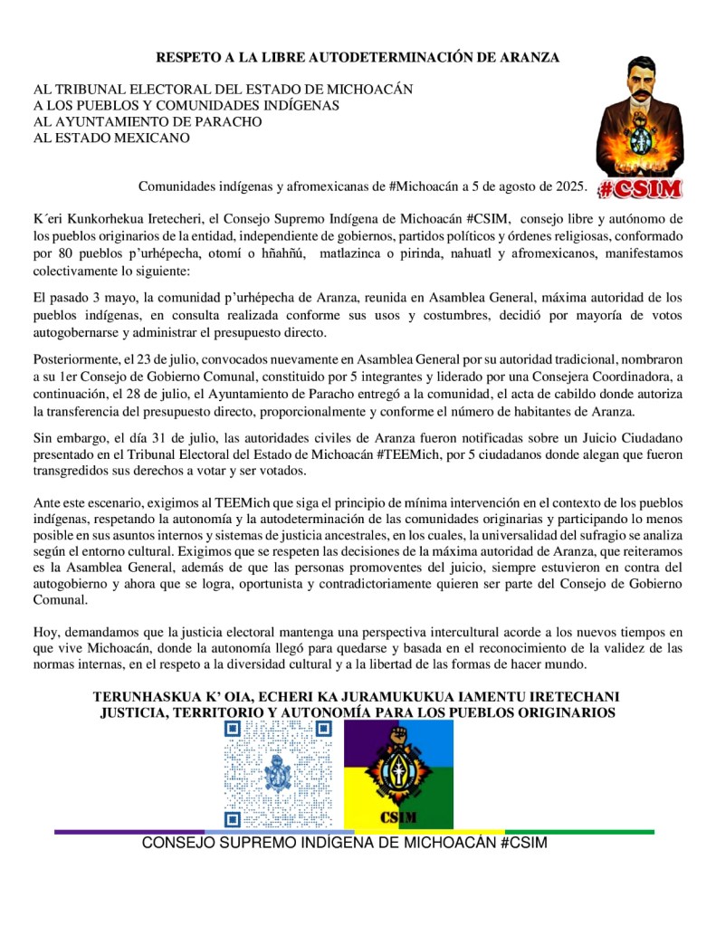 Por cierto, el pasado viernes 5 de septiembre, en la cuarta asamblea del plan de justicia del pueblo purhépecha en San Ángel Zurumucapio, municipio de Ziracuaretiro, fueron colocadas varias lonas rechazando la intervención del CSIM en algunas comunidades originarias. Asistieron 195 autoridades comunitarias y de 22 instituciones de gobierno.