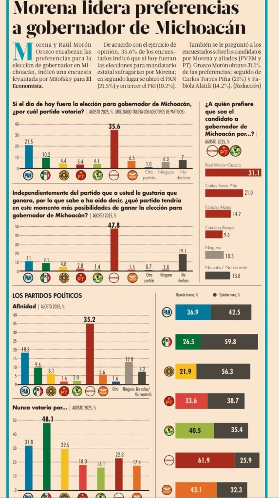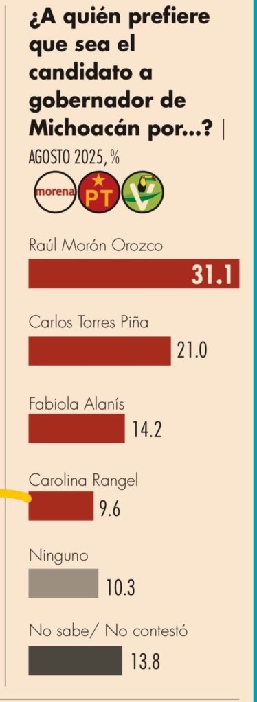 MORELIA, Michoacán, 10 de septiembre de 2025.– La ventaja que tiene Raúl Morón Orozco, en la contienda interna de Morena por la candidatura al gobierno de Michoacán, es inalcanzable, así lo demuestra Consulta Mitofsky, en su ejercicio de tendencias electorales en el estado publicado este día, que coloca al senador con un 31.1 por ciento de las preferencias, muy por encima de otros aspirantes.