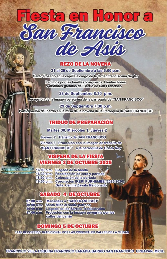 Este día, los barrios tradicionales, realizan una serie de actividades religiosas, desde las mañanitas y posteriormente una misa; por la tarde, el arribo de los barrios al templo de San Francisco, en el centro de Uruapan.