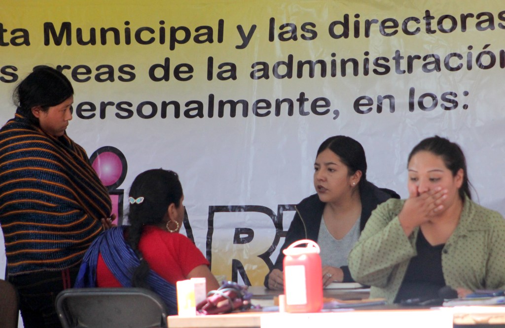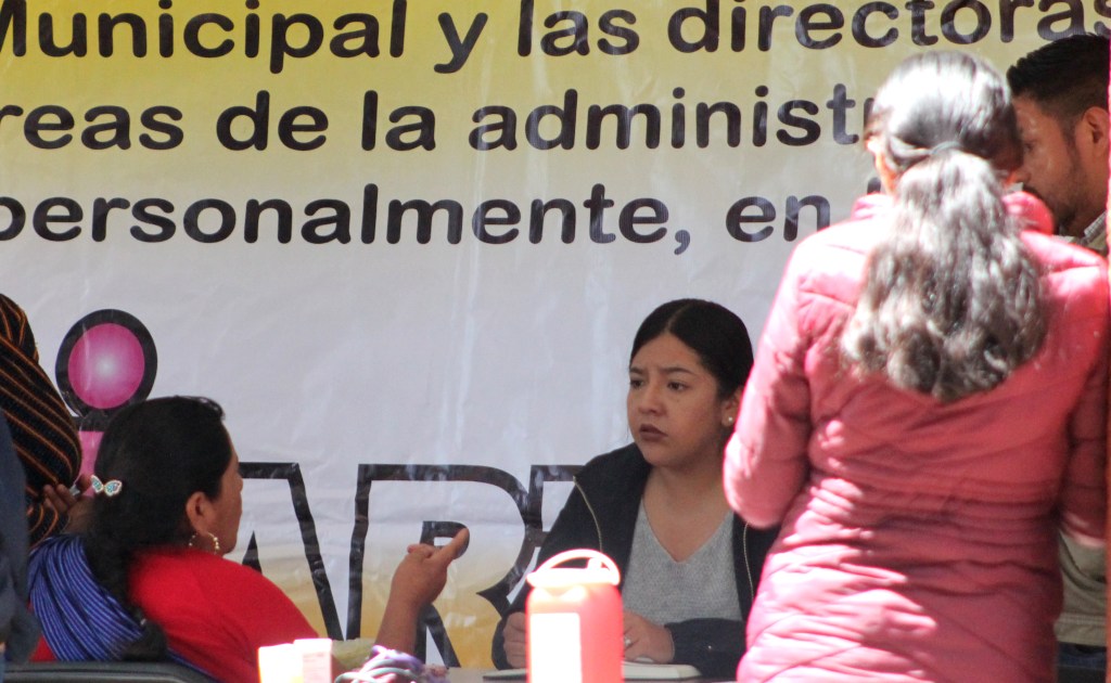 Los directores y la presidenta municipal, instalan mesas de atención en el portal y explanada, donde atienden a las personas, dependiendo de la necesidad.