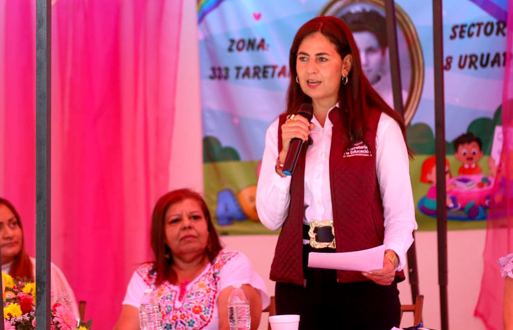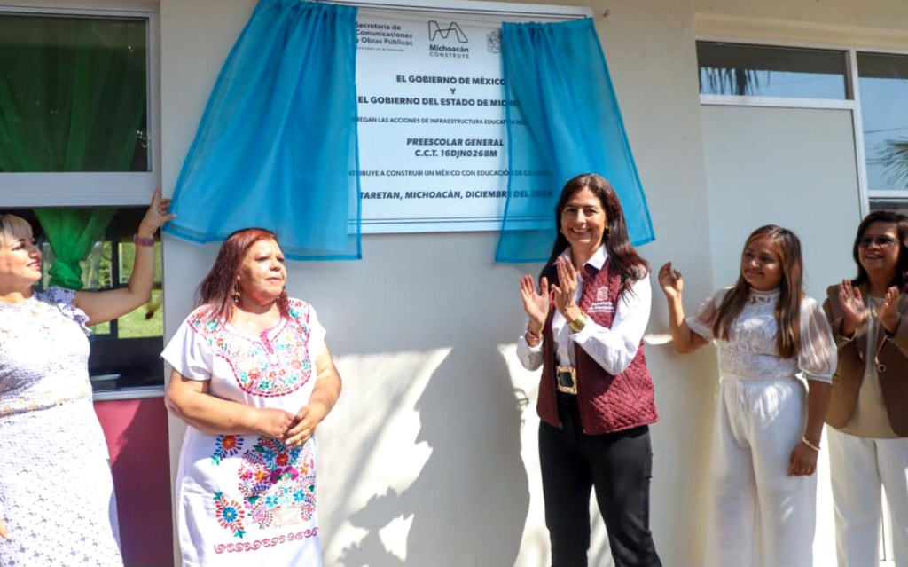 TARETAN, Michoacán, 17 de octubre de 2025.- La secretaria de Educación, Gaby Molina, entregó la Presea «Cuca García», a la maestra Rosalía Rivera Villa, por su amplia trayectoria e inauguró el preescolar «María del Refugio García Martínez», que tuvo una inversión de 2.6 millones de pesos, ejercidos en coordinación con la Secretaría de Comunicaciones y Obras Públicas (SCOP).
