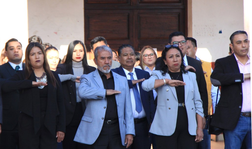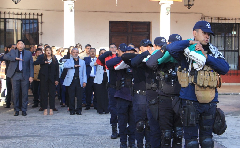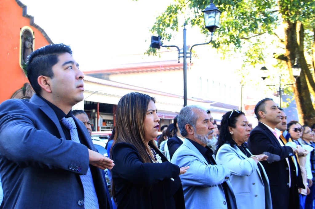 El izamiento se realizó con el apoyo de elementos de Seguridad Pública, contando con la presencia del presidente municipal, Salvador Martínez Gutiérrez; la presidenta del DIF Municipal, Célida Victorio Rodarte; la Síndica Municipal, Sandra Berenice Crisóstomo Sebastián; así como el secretario del Ayuntamiento, Andrés Arroyo García y el Comisariado de Bienes Comunales, Salvador Cupa.
