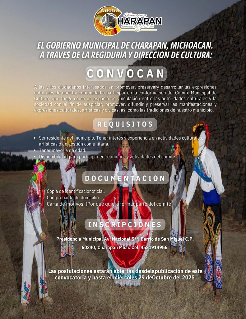 CHARAPAN, Michoacán, 27 de octubre de 2025.– Con la finalidad de auspiciar, promover, difundir y preservar las manifestaciones y expresiones culturales, artísticas, cívicas y las tradiciones del municipio, el Ayuntamiento de Charapan ha convocado a personas interesadas, a conformar el Consejo Municipal de Cultura.