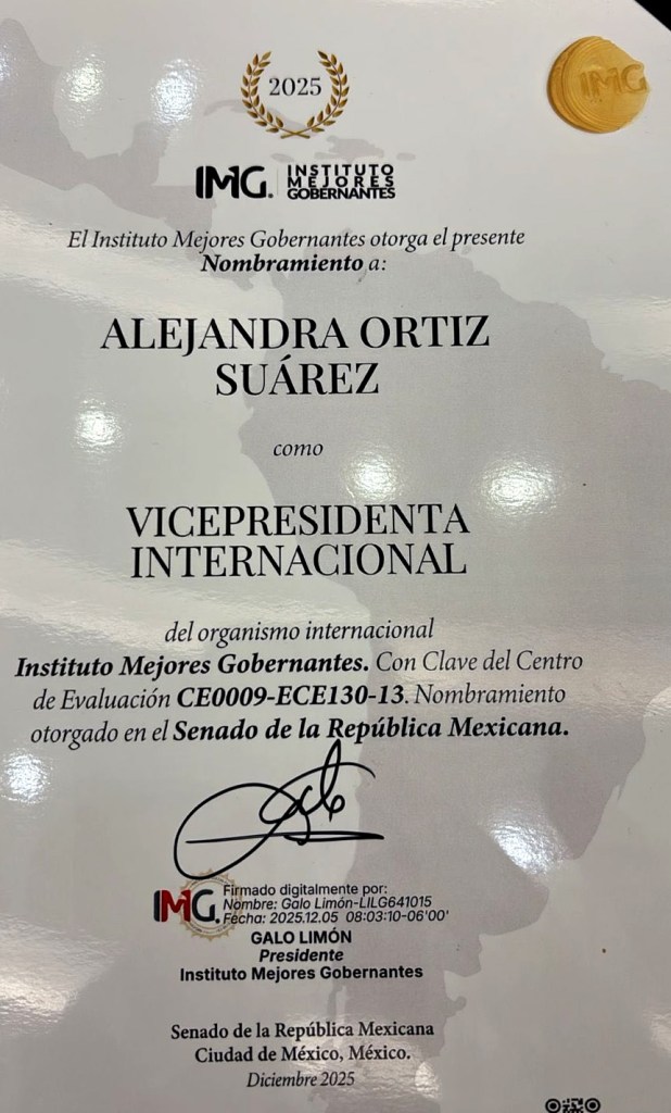 CIUDAD DE MÉXICO, 15 de diciembre de 2025.– El Instituto de Mejores Gobernantes, avalado por el Senado de la República, entregó un reconocimiento a la presidenta municipal de Chilchota, Alejandra Ortiz Suárez, por el buen gobierno, distinción, que dijo, enorgullece a su municipio.