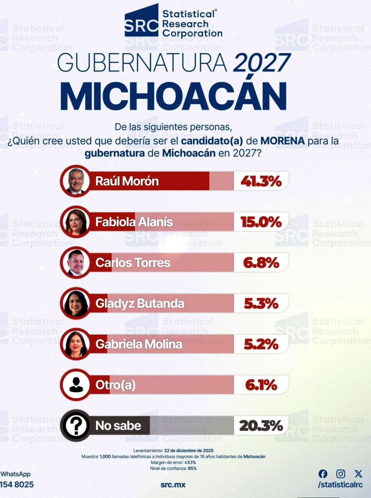 MORELIA, Michoacán, a 07 de enero de 2026.– De acuerdo con el más reciente estudio de opinión, realizado por la encuestadora Statistical Research Corporation (SRC), el senador Raúl Morón Orozco, se consolida como el perfil con mayor fuerza y legitimidad para encabezar la candidatura de Morena a la gubernatura de Michoacán en el 2027.