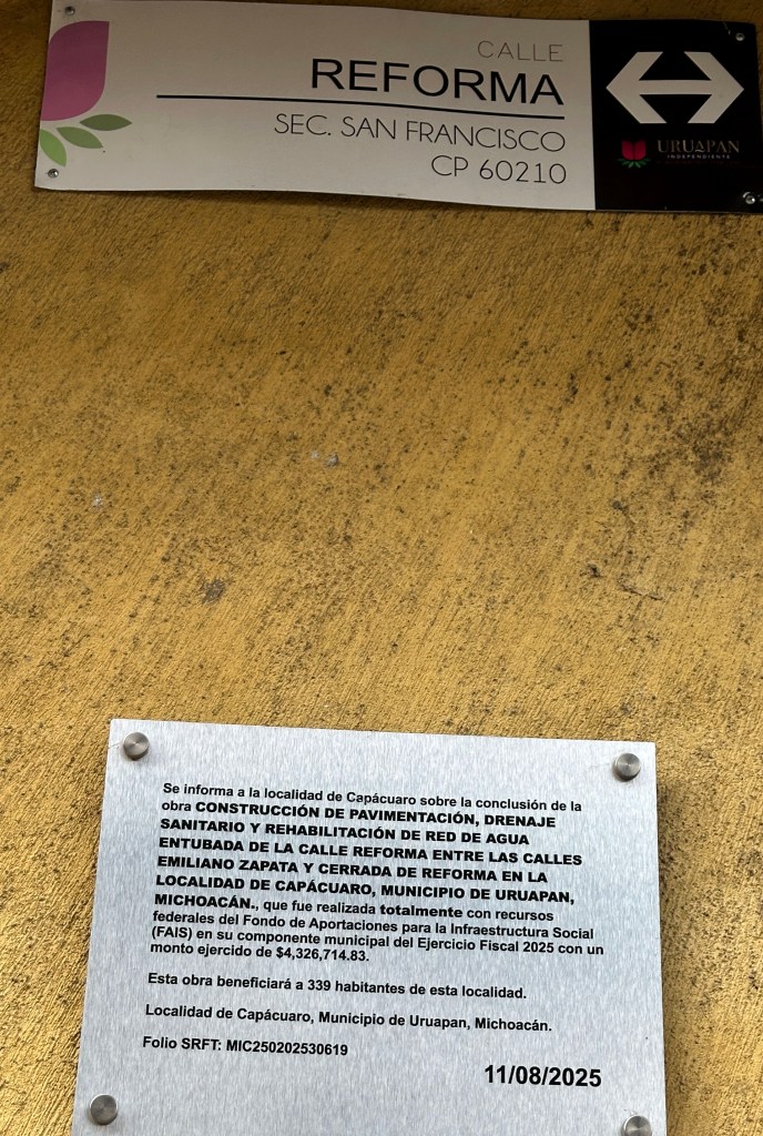 CAPACUARO (Uruapan), Michoacán, 16 de enero de 2026.– Las autoridades municipales, encabezadas por la alcaldesa Grecia Quiroz y las comunales de esta población, inauguraron la construcción de pavimentación, drenaje sanitario y rehabilitación de la red de agua entubada, de la calle Reforma, del barrio San Francisco.