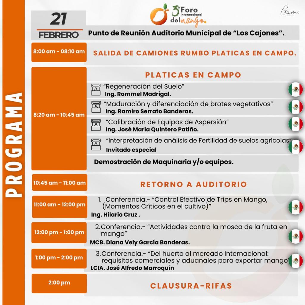 LOS CAJONES (Gabriel Zamora), Michoacán, 9 de febrero de 2026.– Con la finalidad de brindar un impulso a la excelencia del mango mexicano, mediante capacitaciones agrícolas e innovación, habrá de llevarse a cabo la tercera edición del Foro Internacional del Mago, en esta población, los días 20 y 21 del presente mes de febrero.