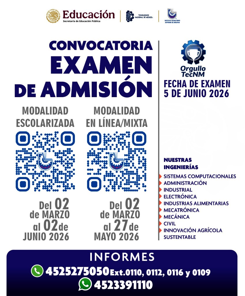 URUAPAN, Michoacán, 2 de marzo de 2026.- El Instituto Tecnológico Superior de Uruapan (Itsu), emitió la convocatoria, para aspirantes a presentar el examen de admisión, que estén interesados en cursar alguna de las nueve carreras de nivel superior, en sus dos modalidades, escolarizado y el mixto virtual, señaló la directora del plantel, Selene Gómez Barragán.
