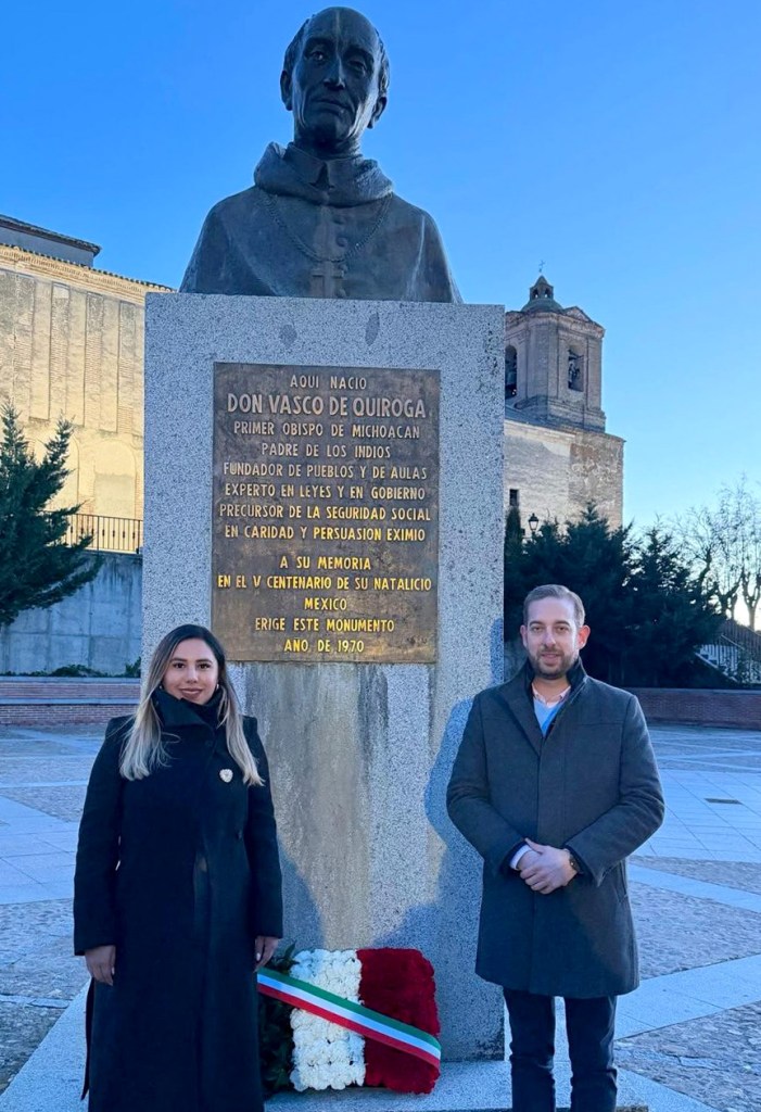 Madrigal de las Altas Torres, España, 15 de marzo de 2026.- En un acto cargado de simbolismo histórico y cultural, la presidenta municipal de Salvador Escalante, Dayana Pérez Mendoza, participó en la colocación de una ofrenda, en Madrigal de las Altas Torres, España, lugar de nacimiento de Don Vasco de Quiroga, mejor conocido como Tatá Vasco.