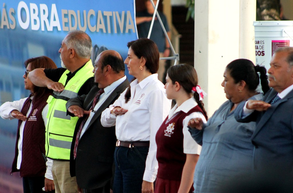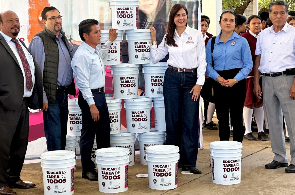 Posteriormente, en la Secundaria Técnica 85 de Toreo el Bajo, inauguró dos aulas e hizo entrega de cubetas de pintura para diferentes planteles educativos de la región.