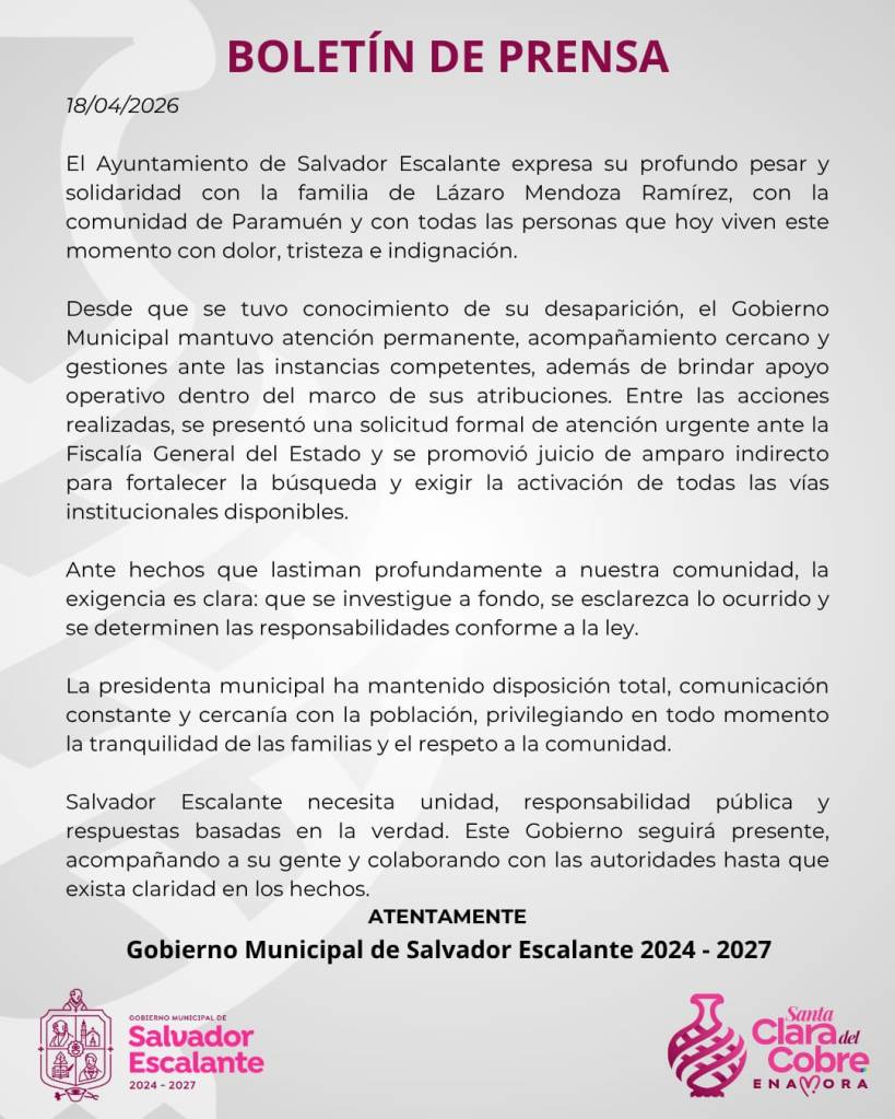 Santa Clara del Cobre, Michoacán, 18 de abril de 2026.- El Ayuntamiento de Salvador Escalante, expresa su profundo pesar y solidaridad con la familia de Lázaro Mendoza Ramírez, con la comunidad de Paramuén y con todas las personas que hoy viven este momento con dolor, tristeza e indignación.